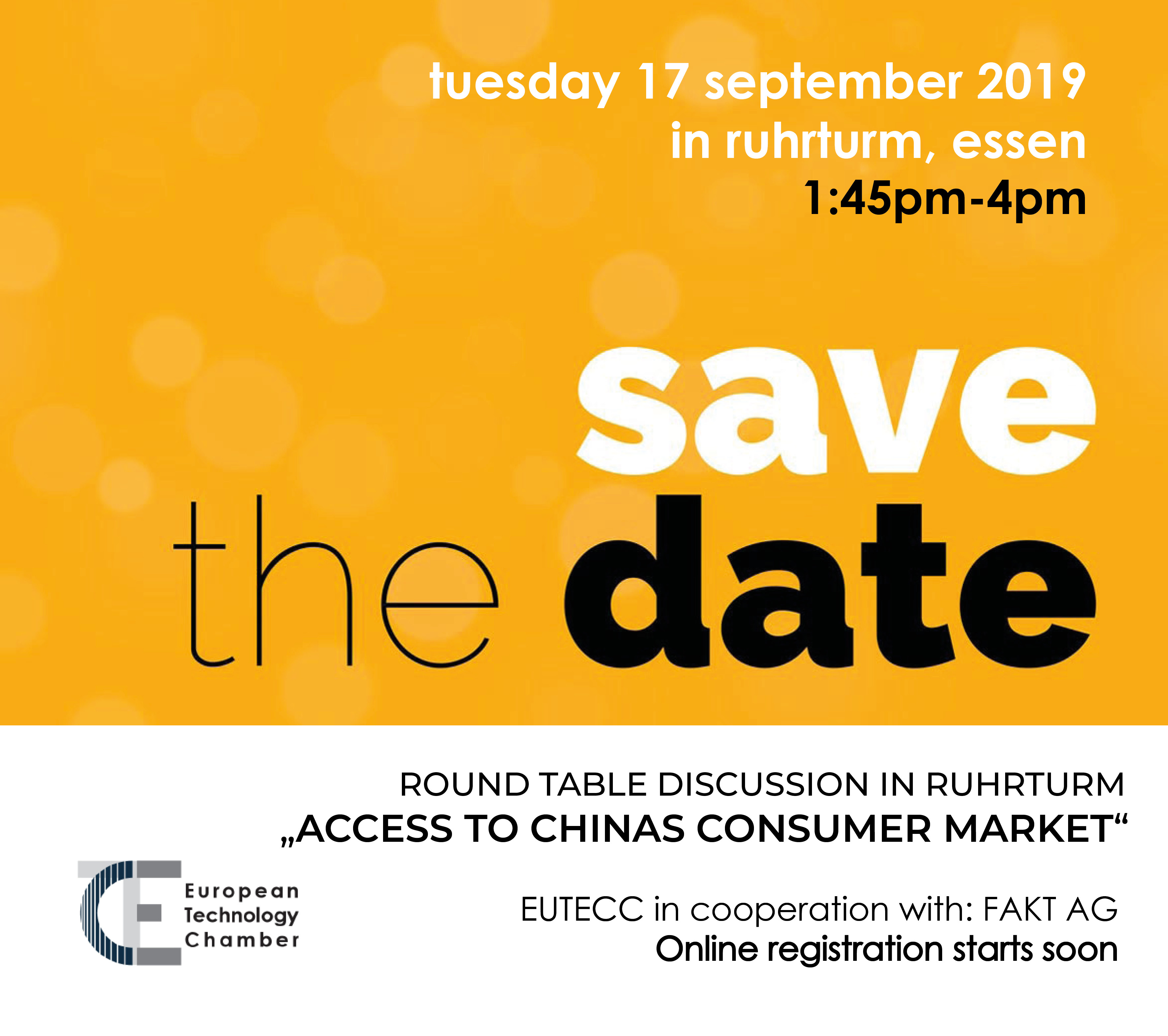 Posted onEUTECC Round Table – Chinas Consumer Market: Access from afar on September 17th, 2019 at RuhrTurm Essen, Seminar Room 5 @ 4th floor / Huttropstrasse 60, 45138 Essen. REGISTRATION here. #EUTECC #FAKT #NRWInvest #SMEs #china #consumermarket Please follow and like us: