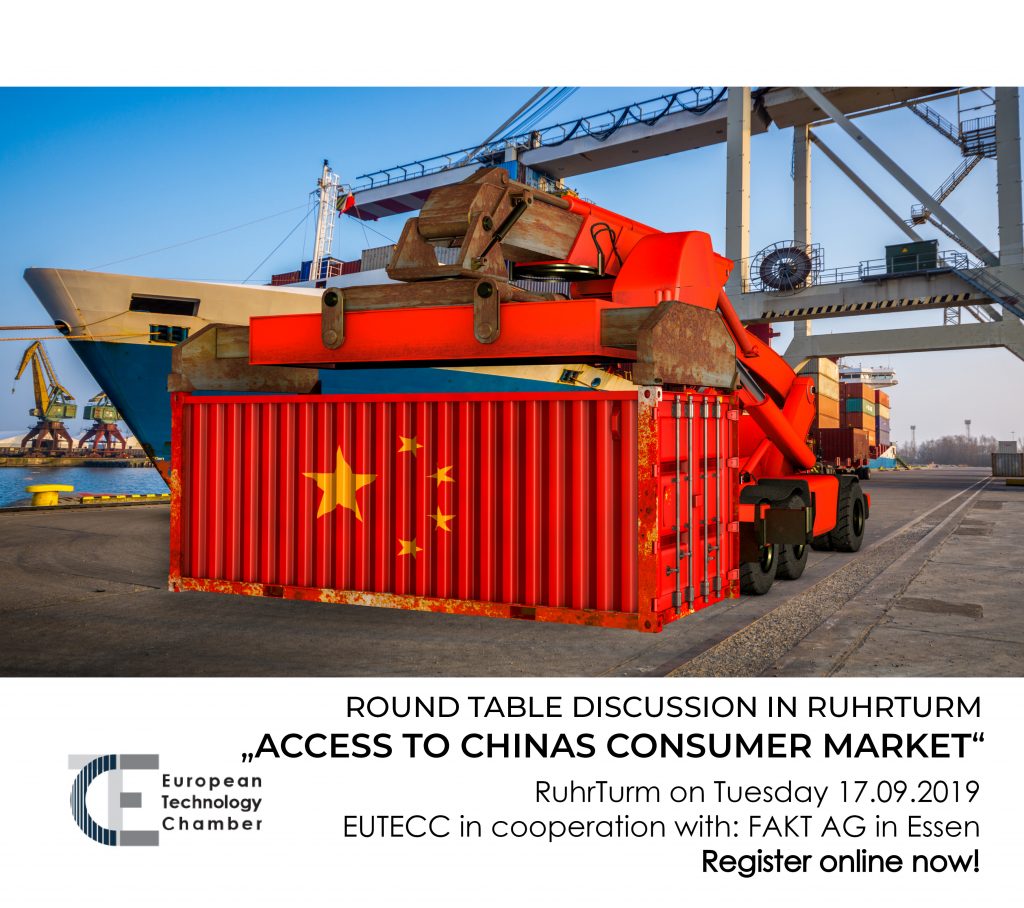 events Round table discussion in Essen on Chinas consumer market: access from afar Posted August 30, 2019September 11, 2019 eutecc EUTECC Round Table – Chinas Consumer Market: Access from afar on September 17th, 2019 at RuhrTurm Essen, Seminar Room 5 @ 4th floor / Huttropstrasse 60, 45138 Essen. REGISTRATION here. #EUTECC #FAKT #NRWInvest #SMEs #china #consumermarket Please follow and like us: